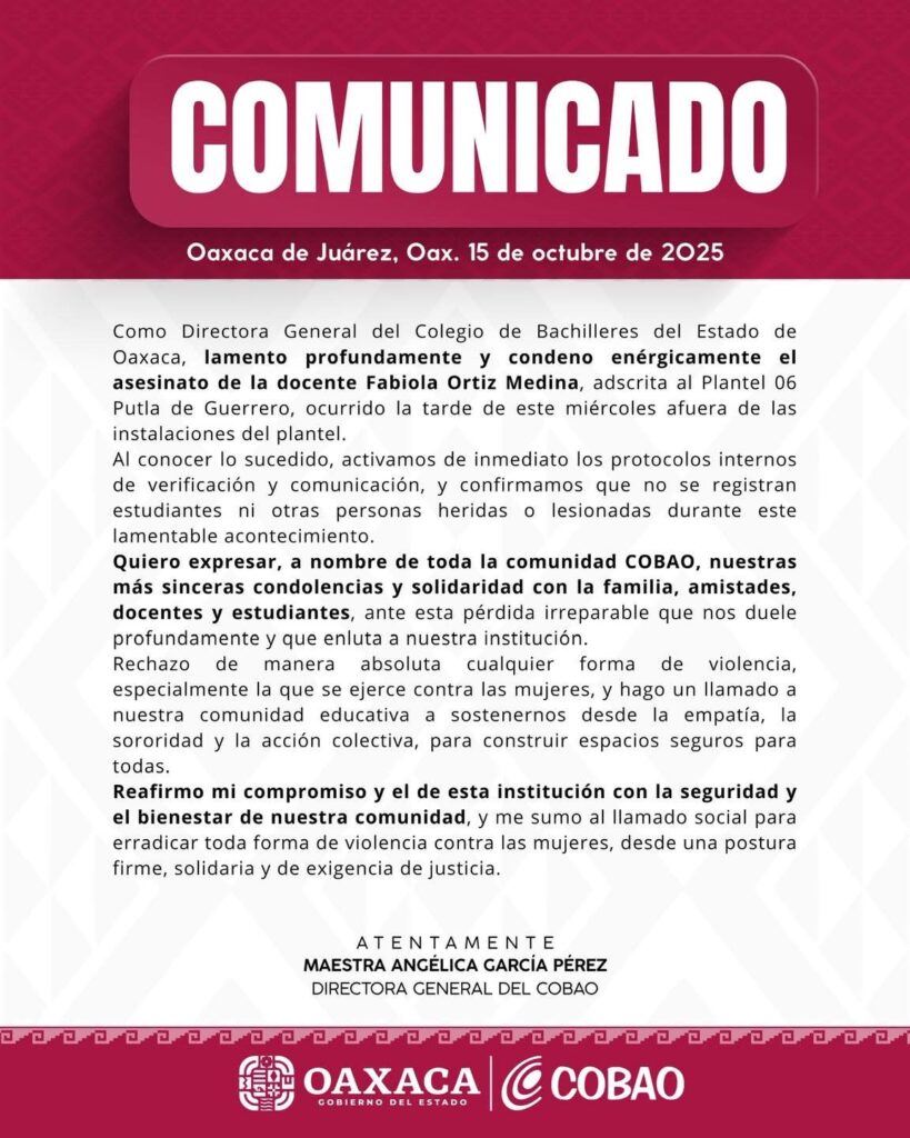 “Quiero expresar, a nombre de toda la comunidad COBAO, nuestras más sinceras condolencias y solidaridad con la familia, amistades, docentes y estudiantes, ante esta pérdida irreparable que nos duele profundamente y que enluta a nuestra institución”, manifestó la directora en el escrito.